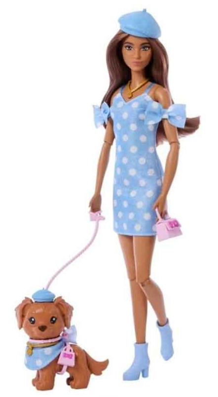 Después de vestir a la muñeca Barbie y a su mascota con looks gemelos, prepara el escenario colocándolas juntas en posturas divertidas: ¡Barbie tiene articulaciones flexibles precisamente para este tipo de juego realista!
