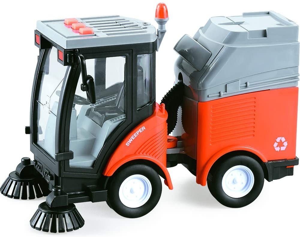 El tamaño de este vehículo está diseñado a escala 1:16; la barredora es naranja y gris con todos los detalles de las de verdad