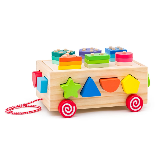 Juguete multiusos. Además del tractor clásico, la tarea del niño es reconocer e insertar la forma en los agujeros correctos. No puedes introducir ninguna figura a través de un agujero en el que no pertenece. Otra actividad es colocar las placas con agujeros en el lugar correcto según la forma, color y número de alfileres. Edad: 2+| Dimensiones: 21,5 x 16 x 12 cm | El juego contiene 12 cubos de diferentes formas. Edad: 2+