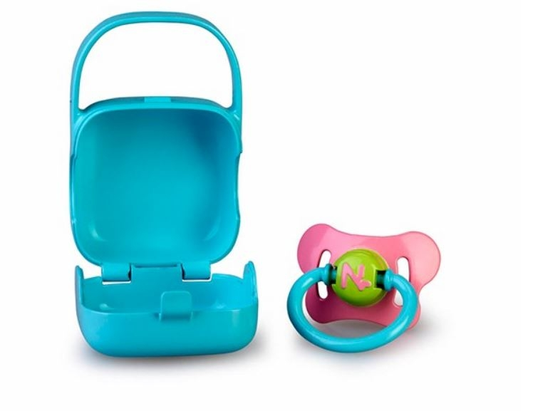ivertido Chupete para Muñeco Nenuco de color rosa con aro azul, incluye un gracioso Portachupetes de color Azul muy practico para guardarlo y que no se ensucie, con ilustraciones de unas nubes.