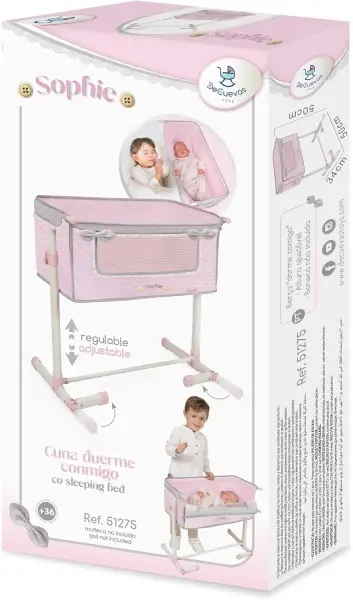 Disfruta de tu muñeca bebé incluso mientras duermes, gracias a esta elegante y práctica Cuna de Muñecas Duerme Conmigo Sophie Ajustable de DeCuevas. Un nuevo espacio con altura ajustable a la altura de tu camita, espacio para una muñeca bebé y detalles en su diseño muy especiales para disfrutar del juego de imitación.
