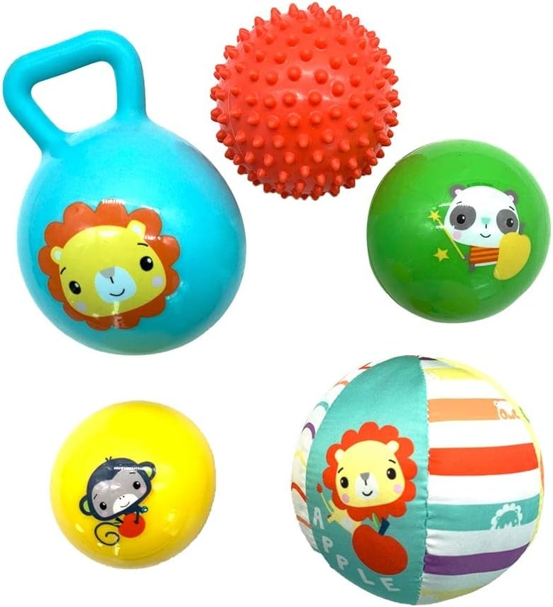Pack de 5 pelotas y sonajeros con diferentes texturas y sonidos. Todas ellas tienen impresos diferentes animales. Recomendado para mayores de 12 meses.