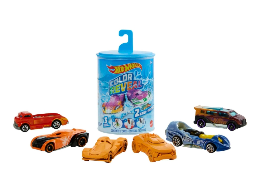 El pack de 2 vehículosHot Wheels Color Reveal contiene 2 vehículos Hot Wheels Color Reveal a escala 1:64 en un tambor, cada uno con 2 decoraciones sorpresa ocultas.