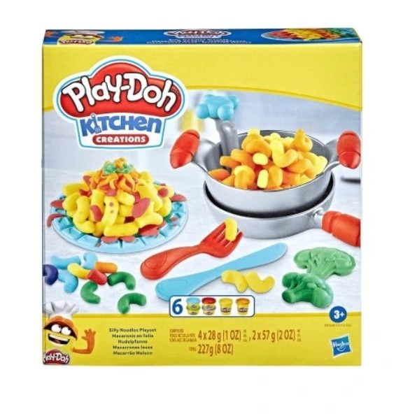 ¡Crea un montón de fideos Play-Doh con las herramientas Play-Doh fáciles de usar en este juego de juguetes de pasta! La olla de juguete es una máquina para hacer fideos Play-Doh que exprime los fideos locos fuera de la olla y luego los corta cuando giras la manivela. Añade algunas mezclas locas con los 4 sellos Play-Doh que te permiten crear divertidas formas de brócoli y otros alimentos de fantasía. Este juguete de macarrones con queso es una excelente actividad o un pequeño regalo para niños de 3 años en adelante. Con 6 latas de mezcla Play-Doh no tóxica, hay mucho color para inspirar la creatividad. ¡En Play-Doh Kitchen Creations, la imaginación es el mejor ingrediente!