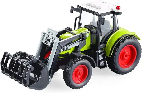 Tractor con pala con 3 tipos de sonido diferentes; claxon, marcha atrás y encendido; la pala tiene 3 posiciones, la primera en alto, la segunda bajada delante del tractor, y una tercera en la que la pala va justo al suelo para cargar